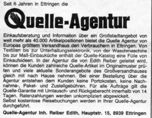 Die Quelle-Agentur selbst bestand anfangs aus einem Tisch, drei Formularblöcken und Frau Reiber. Frau Reiber war gleichzeitig: Benutzeroberfläche – Suchfunktion – Bestellabwicklung.