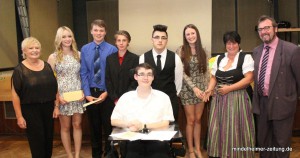 Die Elternbeiratsvorsitzende Claudi Heymanns (2. von rechts) zeichnete die drei Jahrgangsbesten jeder Klasse besonders aus. So (ab 2. von links) Pamela Hintz, Daniel Zech und David Elmer (alle drei 9. Klasse) sowie Marcel Reiber, Dean Horny und Amelia Buchholz (alle drei Klasse V2 ). Zu ihren guten Leistungen gratulierten den jungen Leuten auch Schulleiterin Anna Neumayer (links) und Bürgermeister Robert Sturm (rechts).