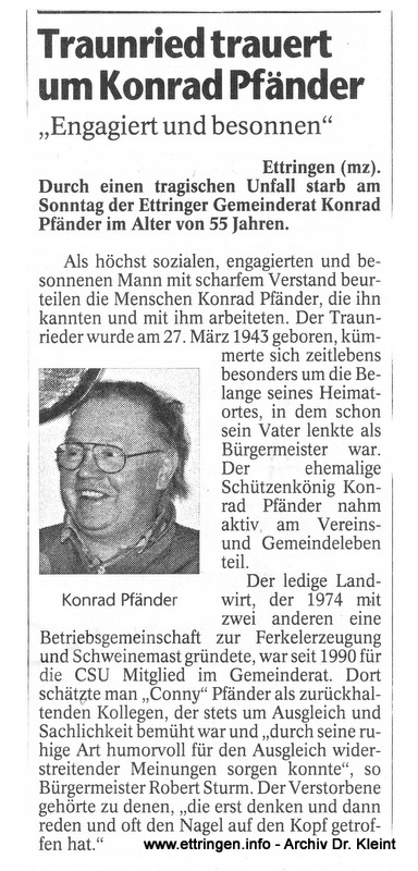 Durch einen tragischen Unfall starb im Dezember 1998 der Ettringer Gemeinderat Konrad Pfänder