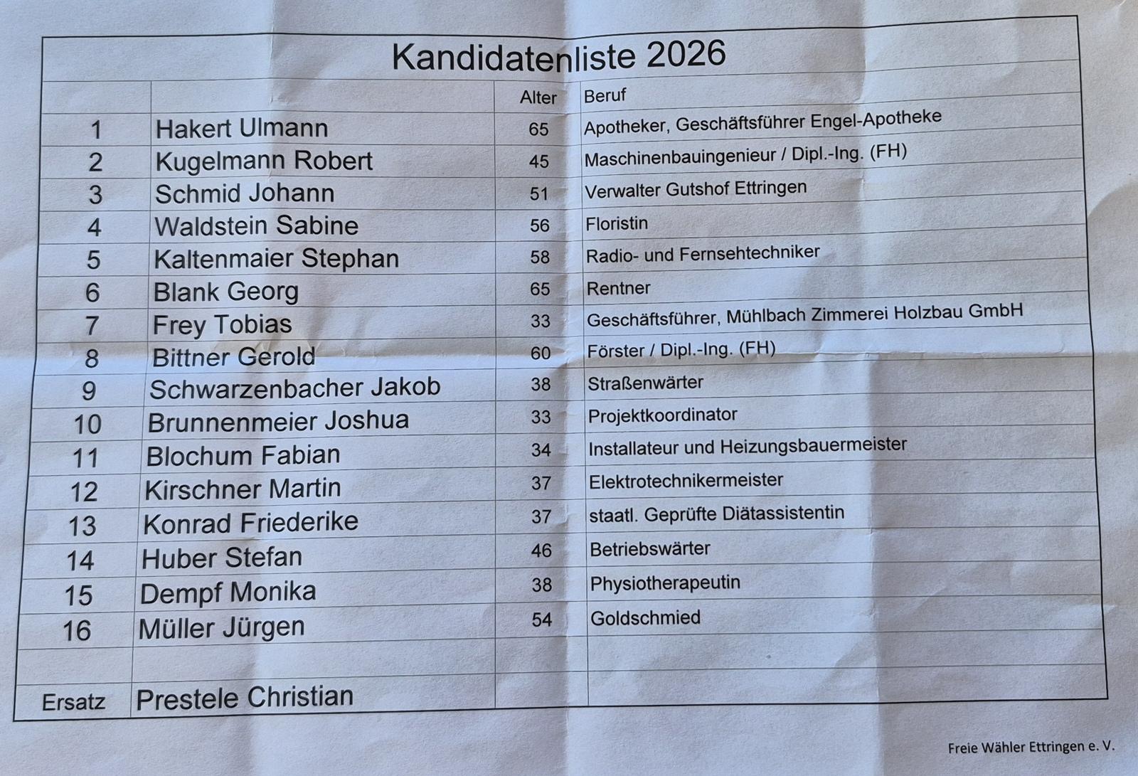 Die Freien Wähler Ettringen haben am 17. Dezember 2025 ihre Nominierungs-versammlung im Ettringer Gasthaus „Rescht-In“ abgehalten. Vorsitzender Robert Kugelmann begrüßte die zahlreich erschienenen Mitglieder und Gäste.