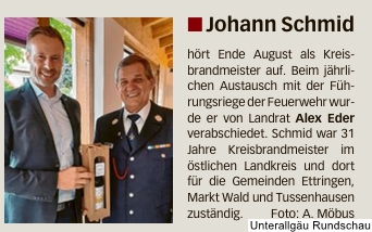 Johann Schmid aus Ettringen hört Ende August nach 31 Jahren als Kreisbrandmeister auf. Beim jährlichen Austausch mit der Führungsriege der Feuerwehr verabschiedete ihn Landrat Alex Eder und würdigte Schmids jahrzehntelanges Engagement.