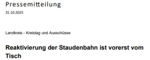 Reaktivierung der Staudenbahn vorerst gestoppt
