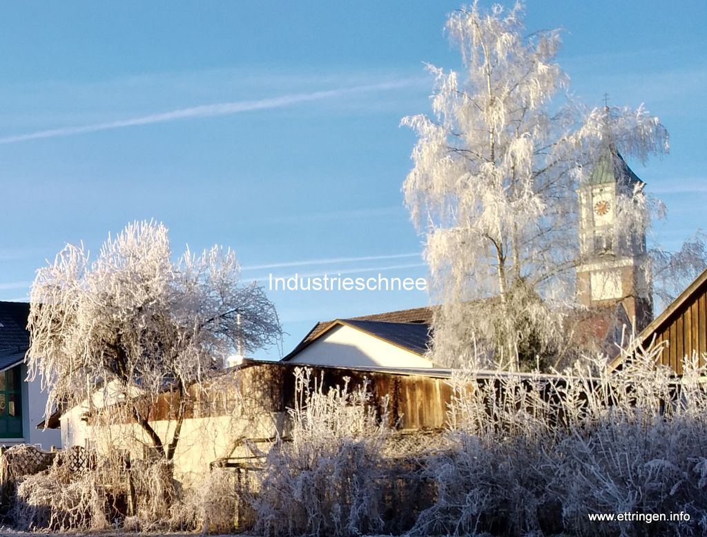 Bei Wetterlagen wie derzeit mit viel leichtem Wind aus Norden fungiert die UPM-Papierfabrik als Schneekanone und legt die südlich gelegenen Ortsteile unter eine Puderzucker-Schneeschicht. Vorsicht ist im Verkehr geboten, denn Industrieschnee kann extrem rutschig werden. Quelle: Mindelheimer Zeitung vom 09.12.16