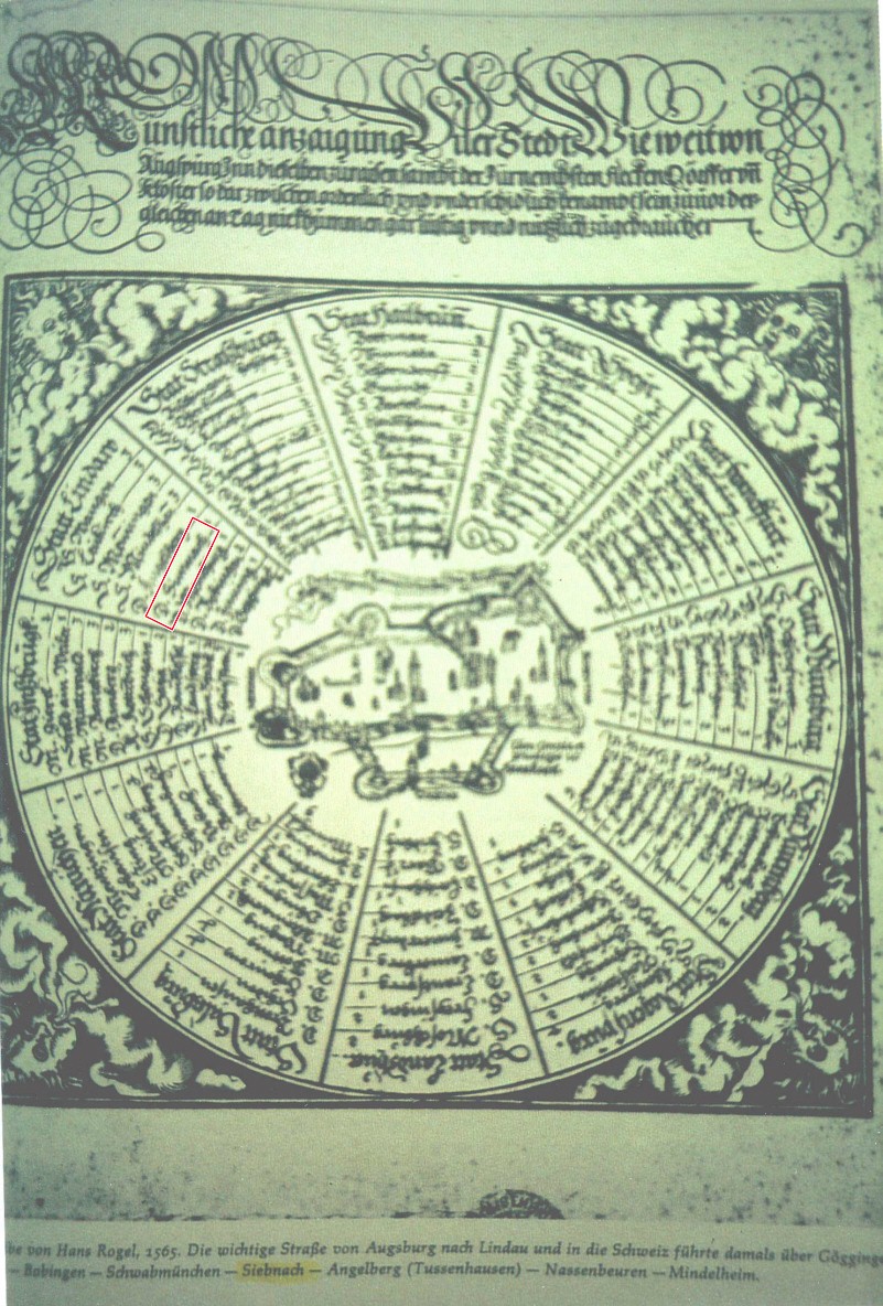 Interessant ist in diesem Zusammenhang die hier abgebildete „Augsburger Meilenscheibe“ aus der Zeit um 1560. Sie zeigt einen in einem Quadrat eingeschriebenen Kreis, in dessen Mitte sich ein Stadtplan von Augsburg befindet. Von ihm aus sind in 12 Segmenten die Reiseverbindungen in die Städte Innsbruck, München, Salzburg, Landshut, Regensburg, Nürnberg, Würzburg, Frankfurt, Speyer, Heilbronn, Straßburg und Lindau wiedergegeben. Als Wegmarken an der Strecke sind die Städte, Dörfer, Märkte und Klöster genannt. Hierbei ist auch Simnach auf der Strecke von Lindau nach Augsburg aufgezeichnet. Die Entfernungen untereinander werden in alten deutschen Meilen angegeben, wobei eine Meile zwei Wegstunden oder 7,4 Kilometern entspricht.