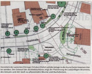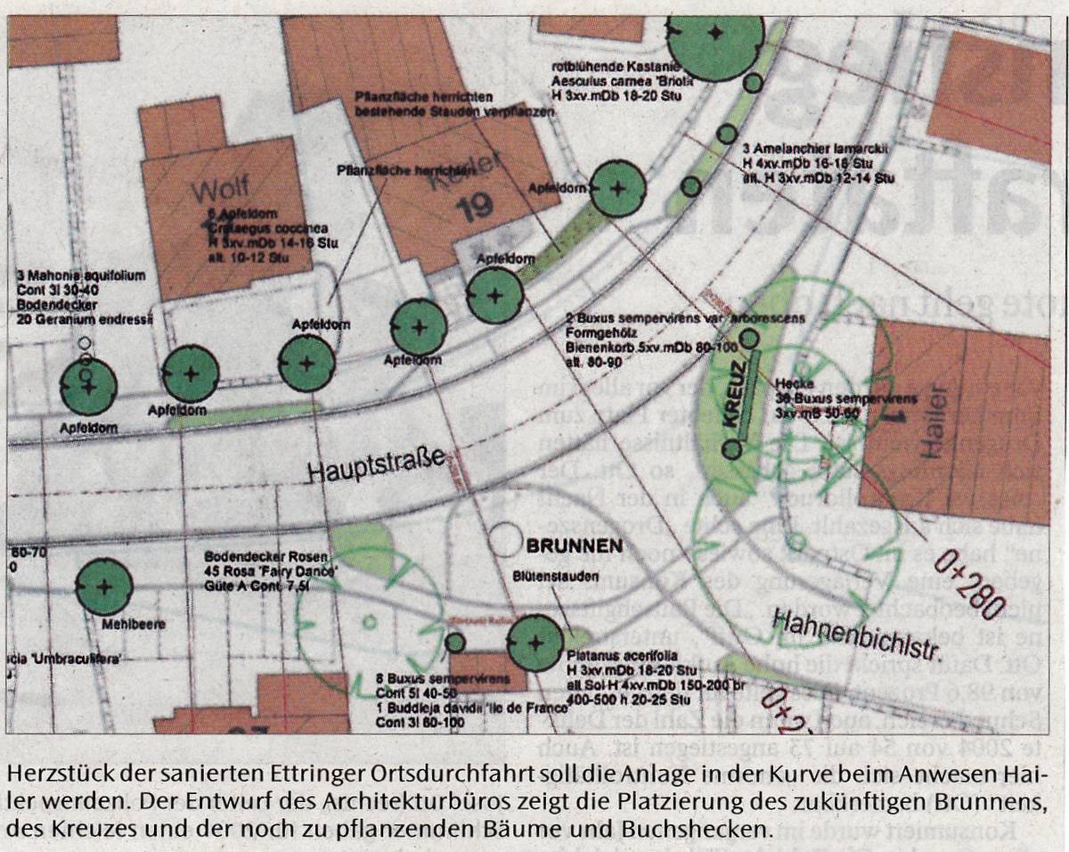 Begleitet werden die Bäume durch Flieder, Weißdorn und verschiedene Stauden. Ein Staudenbeet ist zum Beispiel beim „Blickfang“ vorgesehen. Zwischen Gasthaus Rauch und Bahnlinie entsteht ein Gärtchen mit Buchshecke, Sommerblumen und Lavendel,nahe „Luipold“ ein Ruhepunkt mit Bank. Viel Sorgfalt wird auf die Gestaltung des Platzes in der Kurve beim Anwesen Hailer verwandt, die quasi der Schlussstein und Mittelpunkt der Maßnahme sein soll, wie Bürgermeister Robert Sturm sagt. Von den drei alten Kastanien muss eine fallen, da sie verfault ist. Das dort befindliche Kreuz wurde etwas weiter nach vorne versetzt.Fest steht, dass hier eine Grünanlage mit einem Brunnen entstehen soll. Die Gemeinde hatte sich, wie berichtet, bei der Paulaner-Brauerei um den Brunnenpreis 2004 beworben, ihn allerdings nicht gewonnen. Der hierfür vom Türkheimer Steinmetz Schröder erstellte, moderne Entwurf steht nun im Rat zur Diskussion. Als Alternative ist eine konservativere Lösung im Gespräch, die sich an alten Vorbildern orientiert.